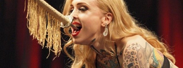 Hun startede nemlig showet med at sluge ild og slukke en cigar på tungen. Inden hun så slå et søm op i næsen til tonerne af MC Hammer. Alt dette, mens de fremmødte i salen ventede på præcis, hvad de vidste ville komme. En cirka halv meter lang sabel var omdrejningspunktet og på det tidspunkt var den røde kjole røget af. Den blonde sabelsluger var nu iført en meget sparsom og gennemsigtig beklædning, hvor man tydeligt kunne se de mange tatoveringer på hendes spinkle krop.