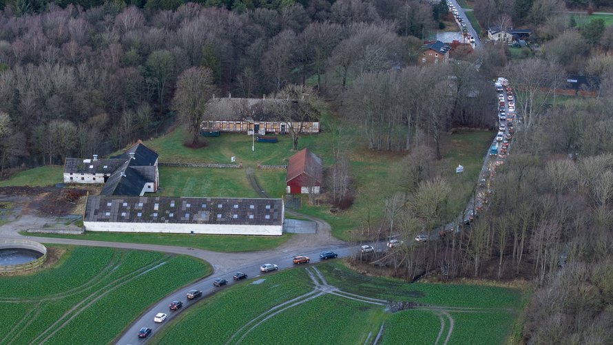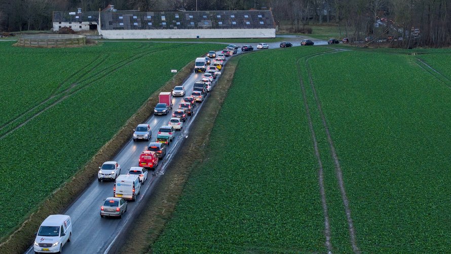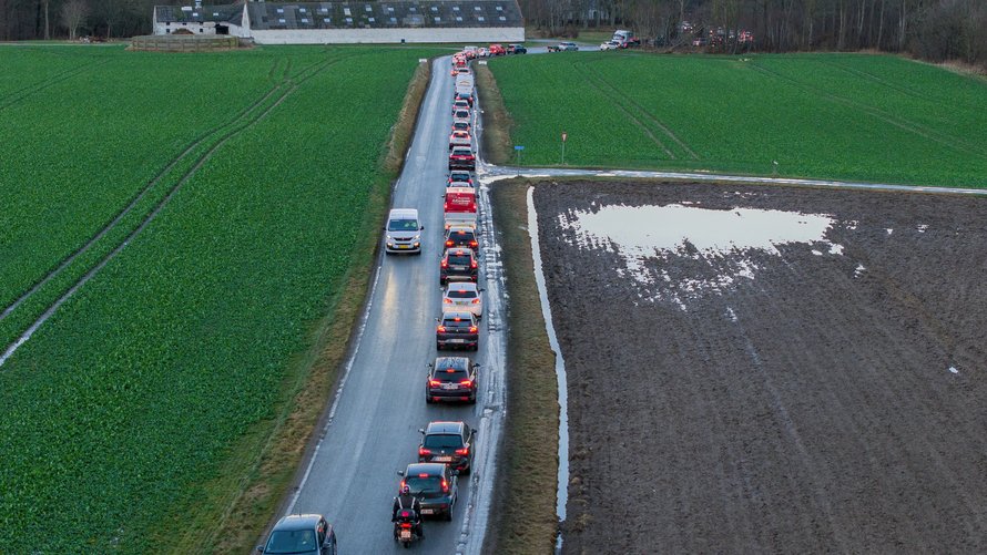 Mellem jernbanen og Tuenvej var trafikken tæt, og ved Mariendal stod der to mænd, som forsøgte at styre trafikken, der gik i sneglefart.