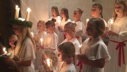 Luciaoptog i gågaden i Frederikshavn på fredag