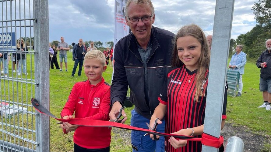Olivia og Max hjalp Peter Laigaard med at åbne nyrenoveret kunstgræsbane