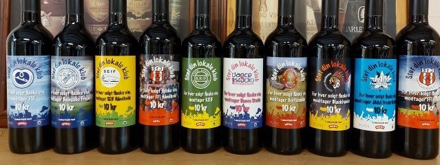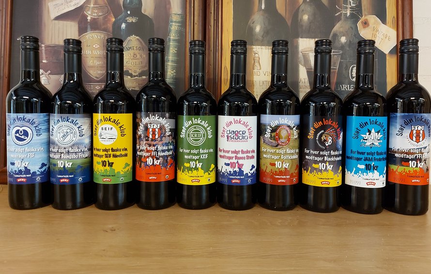 Køb en flaske vin med din klubs etikette på for 60 kroner, så støtter du klubben med 10 kroner. Salget begynder i morgen.