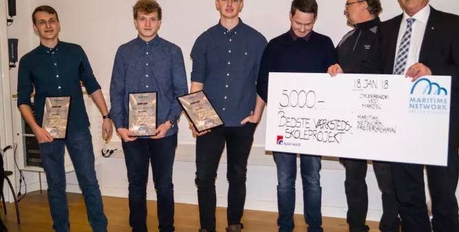 Martime Network Frederikshavn - pris for bedste projekt på Maskinteknisk afdeling. Projektet udarbejdes i forbindelse med det maskintekniske forløb, som alle med en studentereksamen skal gennemføre, i uddannelsens begyndelse. Prisen på 5.000 kr. blev uddelt af Tom Samson, COO Hytek og medlem af Maritime Network Frederikshavns bestyrelse, og gik velfortjent til Peter Sigsgaard, Nico Grønkjær Bruun, Jesper Jensen, Mathias Vinter Knudsen og Mikkel Roslev. Alle fem er klar til at starte på uddannelsens teoretiske del i januar 2018.
