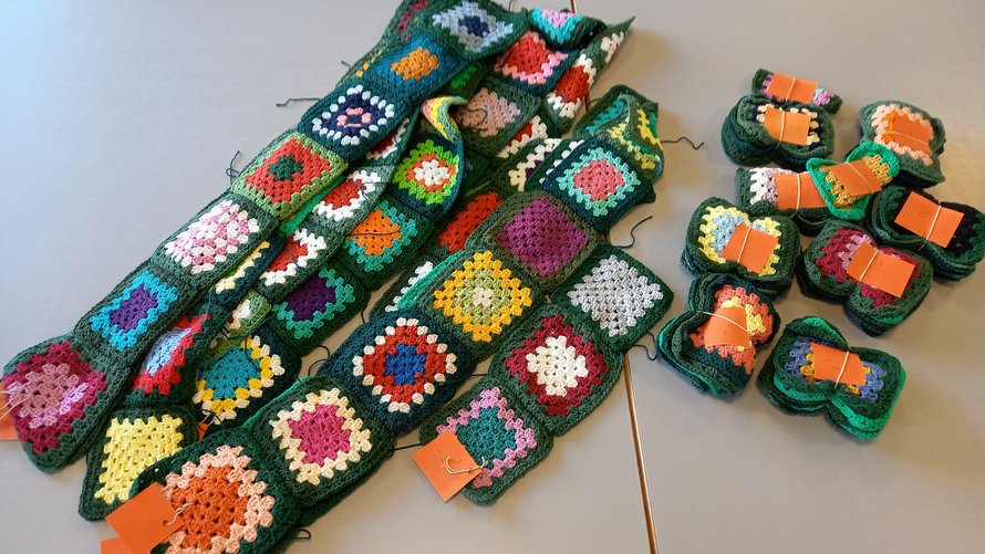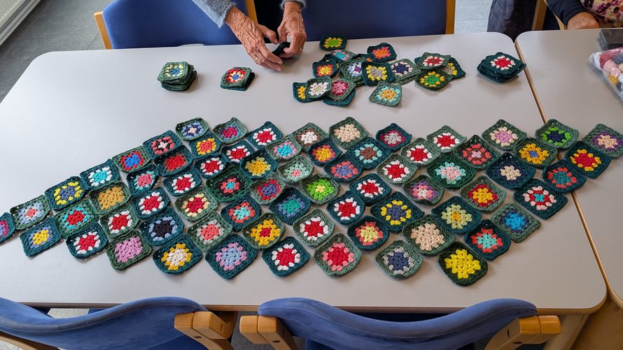 Siden februar har borgerne hæklet tæt på 700 farverige lapper, som er syet sammen til et imponerende juletræ. Centerets frivillige pedel har desuden konstrueret et stativ med hjul, så det hæklede kunstværk kan stå sikkert og samtidig være nemt at flytte.