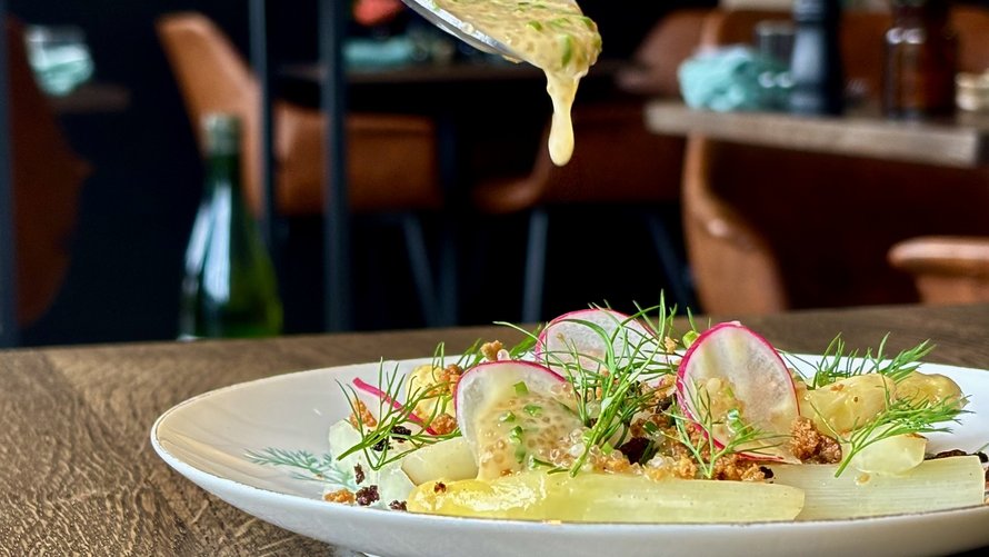 Hvide asparges og stenbiderrogn med beurre blanc, sprødt kyllingeskind og radise