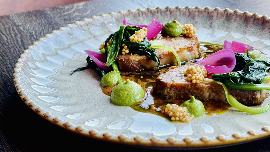 - Pandestegt pighvar med beurre blanc, purløg og stenbiderrogn