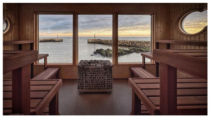 Også fra saunaen er der en fantastisk udsigt over yderhavnen, molehovederne og Ålbæk Bugt.