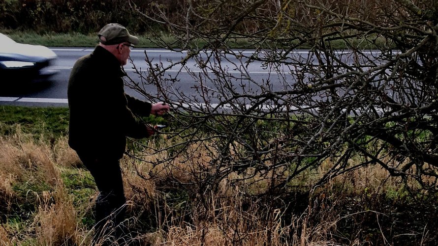 - Nu gik turen hjemover, men vi skulle da lige forbi Gullev, hvor de to herrer tidligere på året havde fundet et spændende pæretræ i vejkanten ved kirken på Borrevej. Her blev der i nattens mulm og mørke klippet podekviste af den gode pære, oplyser Finn Borbjerggaard.