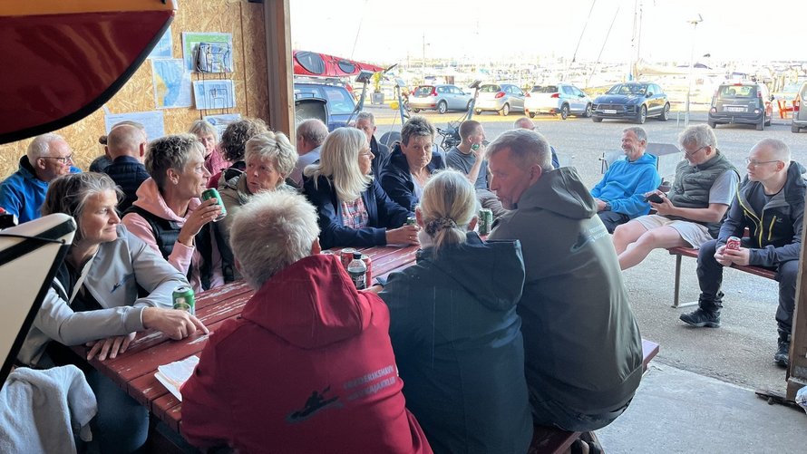 - 24 af klubbens medlemmer var mødt op for at fejre de nye roere, der blev mødt med store klapsalver, da de viste deres færdigheder med selvredninger og makkerredningerne i Frederikshavn Marina. At vi kan samle så mange til et sådant arrangement, efter at de nye roere har bestået eksamen, er et tydeligt bevis på, at der er et rigtigt godt kammeratskab i klubben, siger formand Hans Chr. Højslet.