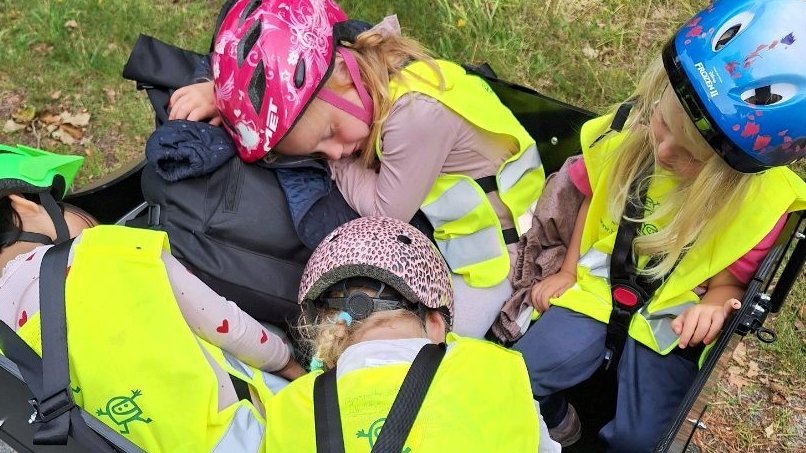 - Da vi kom i land på Læsø, gik turen til Storhaven. Efter godt fire kilometer måtte vi dog holde en kort pause ppå grund af en punktering på foodtrucken. Efter et lille uventet pitstop gik turen igen imod Storhaven. Her gik alle børn og voksne på oplevelse i naturen blandt geder, æsler, katte/killinger, hunde og kaniner. Madpakken blev spist i indhegning, godt skærmet var de meget madglade æsler og svin. Der blev leget lidt mere efter maden, og derefter skulle vi på oplevelsetur på de stille veje på vej imod færgen, men næsten alle børn faldt i søvn i cyklerne og fik sig en fortjent lur. Klokken 16.30 landede vi igen i børnehaven, og alle forældre stod klar til at hente nogle trætte børn, fortæller pædagog Jeanette Græsdal Petersen.