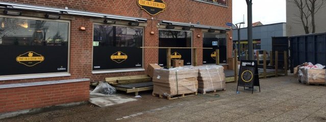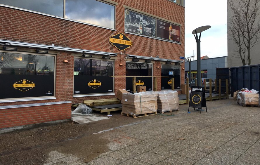 Er stor træterrasse er placeret foran hjørnebygningen, og den bliver helt sikkert populær - ikke mindst i sommerhalvåret, hvor Old Irish Pub er det første, som gående færgepassagerer fra Norge og Sverige ser, når de går i land i Frederikshavn.
