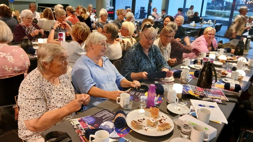 Fra Bangsbo Aktivitetscenter deltog en flok engagerede strikkere. Flere mødes i forvejen og strikker sammen i huset, mens andre bruger aktivitetscentres cafe, deltager i motion, kreative tilbud eller har engageret sig som frivillig. Men denne aften i Arena Nord har de sat et nyt hold, hvor de er sammen om at strikke blå VM-huer. Rundt om bordet kom der gang i både strikke- og snakketøj.