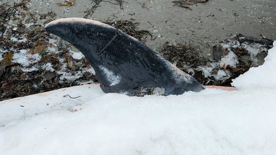 Niels Ole Christensen, som bor i Bratten, vurdede, at han fredag eftermiddag - under en gåtur langs iskanten ved havet mellem Engsig Bæk Kanal og Kragskov Å - fandt et godt tre meter langt øresvin i iskanten.