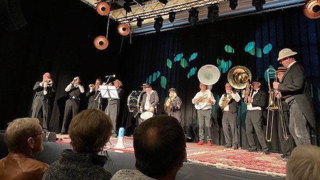 Og sådan gik alt i alt et par medrivende timer med også Tigerrack, Champagnegalop, Boogie tju tju, Lady Madonna m.fl. og med flotte solopræstationer af også Henrik Bangsbo på trækbasun, Mogens Bangsbo på den stærkt CO2-forurenende og derfor snart forbudte bastuba - sousafonen - med "Step on my blue suede shoes" - selv iført røde - og af Mona Bangsbo Hansen - mærkeligt nok eneste tilbageværende kvindelige medlem. Hun brillierede med en flot bækken-solo.