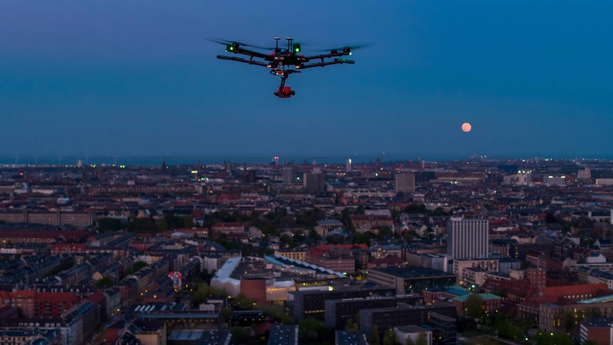Dronen flyver i 80-120 meters højde, og man vil muligvis kunne høre en svag brummen herfra.
