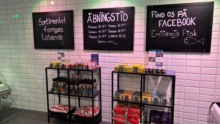 Emilievejs Fisk har åbent mandag til fredag fra kl. 10.00-17.30 samt lørdag fra kl. 10.00-14.00.
