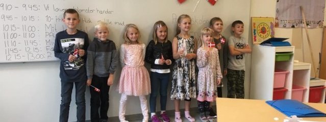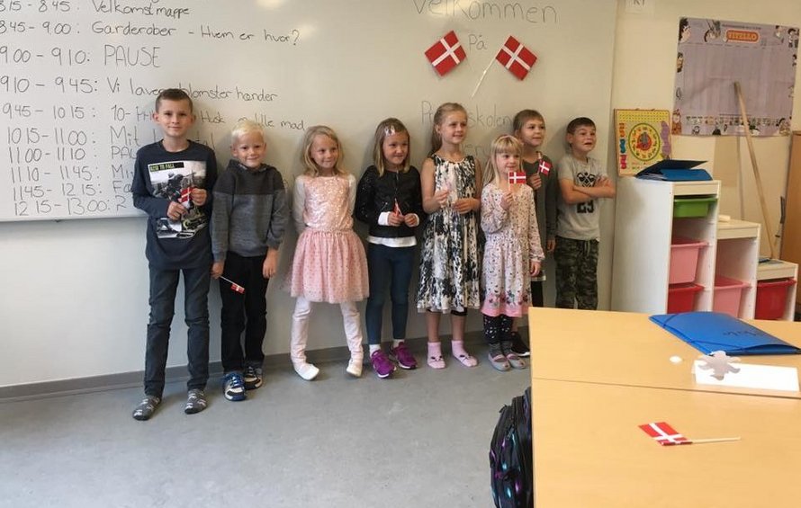 Der var både flag i klasselokalet og i Jerup by, da Privatskolen i Jerup havde første skoledag.