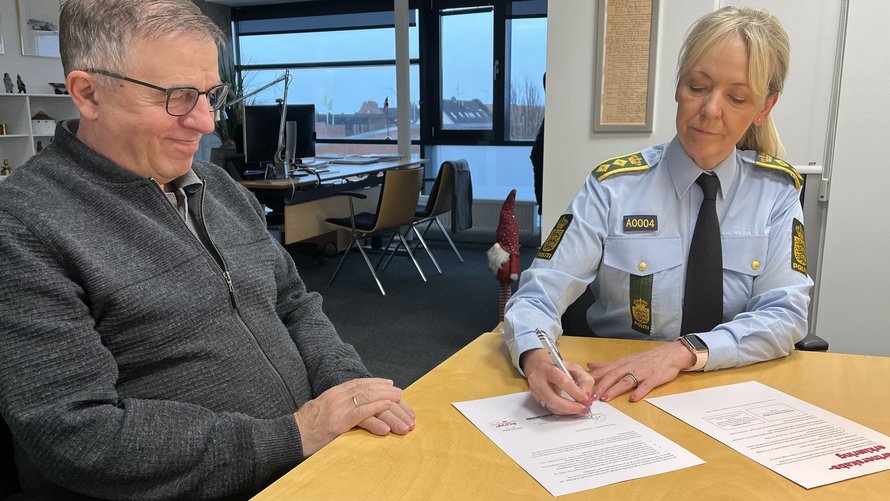 Politidirektør Anne Marie Roum Svendsen og borgmester Karsten Thomsen underskrev en ny partnerskabsaftale på rådhuset i Frederikshavn i formiddag.