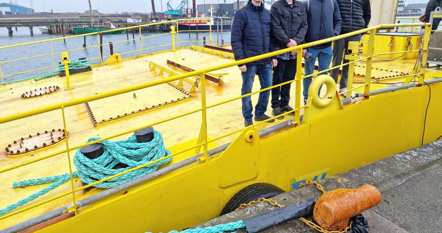 Planen er, at eleverne selv skal bygge et lille bølgeenergi-anlæg med inspiration fra Crestwings teknologi. Derfor er de nede og se nærmere på det gule anlæg, der ligger ved kaj i øjeblikket.
