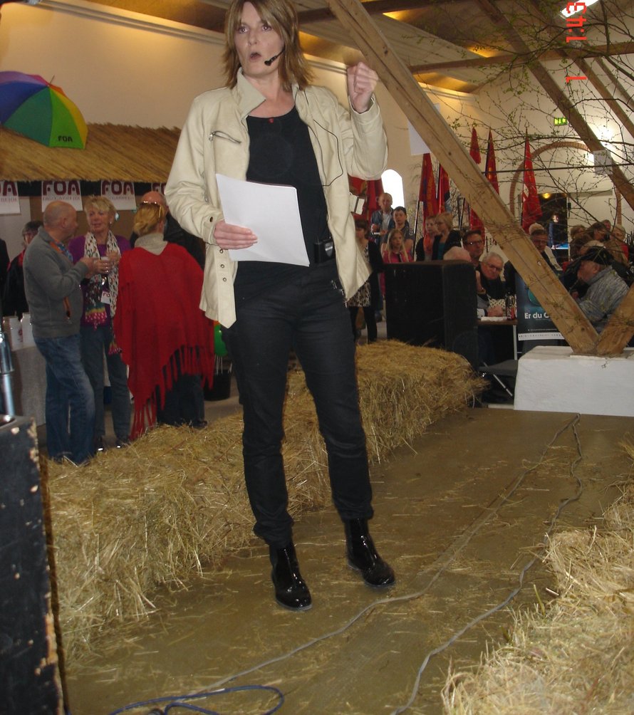 Herefter kunne Birgit sætte kursen mod Knivholt i Frederikshavn, hvor dagens hidtil største 1. maj fremmøde var en realitet. Ja, jeg erindrer faktisk ikke et større fremmøde på Knivholt de seneste mange år, og jeg vil antage, at 400 eller flere var fremmødt. Dejligt med så stor en opbakning til både arrangører og talere. Her leverede Birgit igen sin gode tale, og Bjarne Laustsen sluttede hans med en varm anbefaling af Birgits person på borgmesterposten i Frederikshavn Kommune. Det varmede i mit røde hjerte, og Birgit blev også rigtig glad for opbakningen.
