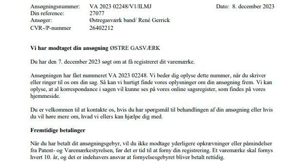 - Ifølge Varemærkeloven er et varemærke gældende, når det tages i brug. Altså da vi startede bandet Østre Gasværk 1996/97. Vi vælger 5. december 2023, at René ikke længere er en del af Østre Gasværk, hvilket han selv bekræfter. Derfor er han heller ikke længere rettighedshaver af varemærket, mener "det gamle" Østre Gasværk.