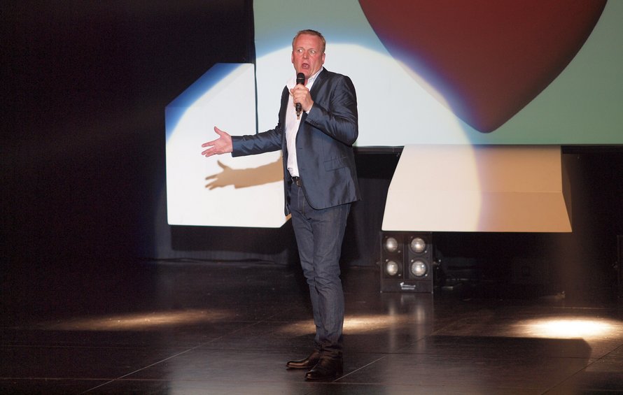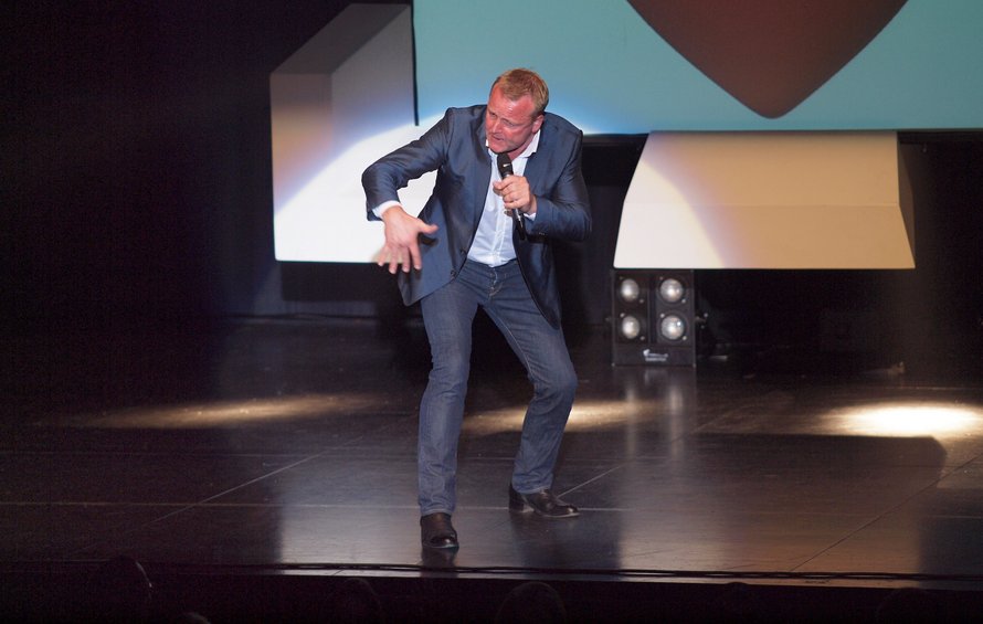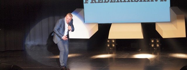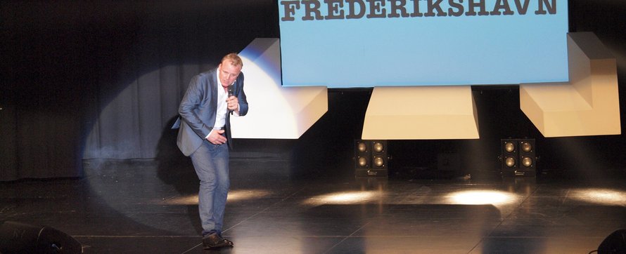Inden det hele gik i gang, viste man billeder på selvsamme skærm i midten af scenen. Det var snapshots taget af folk i salen, mens de sad med et skilt med en kærlighedserklæring til Frederikshavn. Det gjorde blandt andet Jenny fra Man Diesel, som sad på forreste række og dermed selvfølgelig var et oplagt emne for komikeren oppe på scenen. Men ham Gintberg fik altså ikke det hele med, da han udspurgte frederikshavnerpigen om, hvem hun var, og hvor hun arbejder. Dermed blev Man Diesel til Man Leasing – og straks troede den sjove mand, at der så var tale om et udlejningsbureau af mænd.