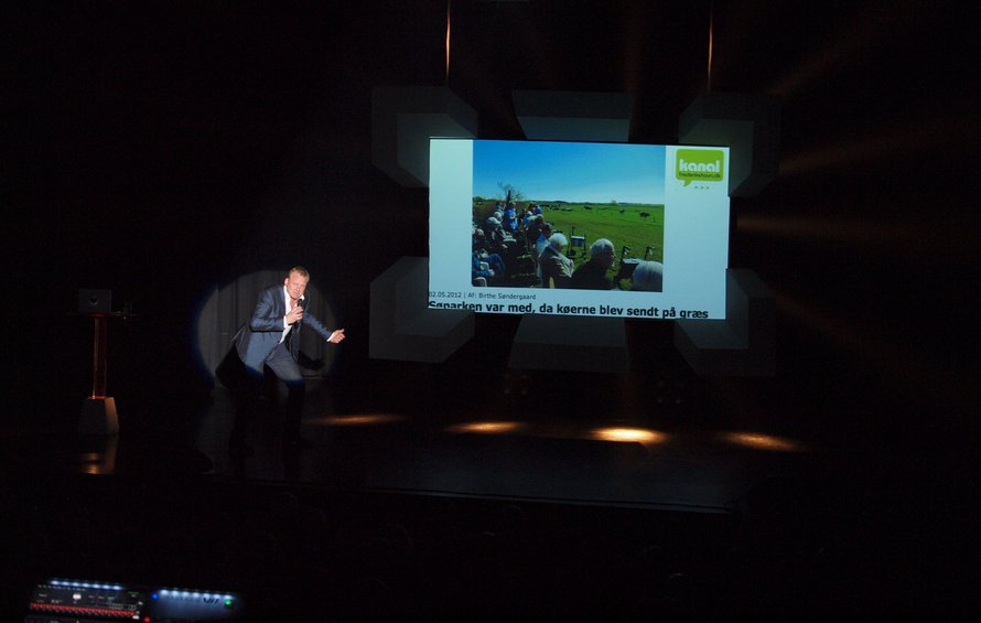 Samtidig undrede han sig over, at man nede på Katfizk stavede alt med z og kaldte Mogens Pølsemand for pølse-mafiaen her i byen, der serverer Danmarks gladeste pølser. Han undrede sig over, at man havde placeret palmer nede ved vandet og om, der ikke var skibe nok nede i havnen, siden man også ville have et midt i gågaden. Endelig fik han salen til at more sig over en artikel fra Kanal Frederikshavn om en gruppe pensionister fra Søparken, der blev kørt ud som tilskuere, da en flok begejstrede øko-køer blev sluppet ud på græs efter at have været spærret inde hele vinteren.