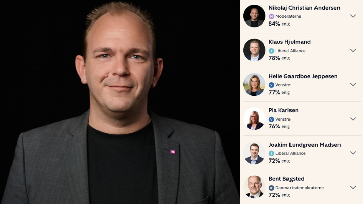 Men jeg må indrømme, at jeg blev noget overrasket over resultatet. Ifølge testen er jeg mest enig med Nikolaj Christian Andersen fra Moderaterne – hele 84 procent enig (se billedet). Det havde jeg bestemt ikke set komme, og min sandsynlighed for at stemme på ham er faktisk ret lille.