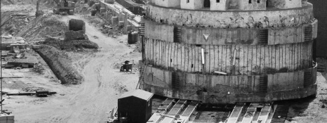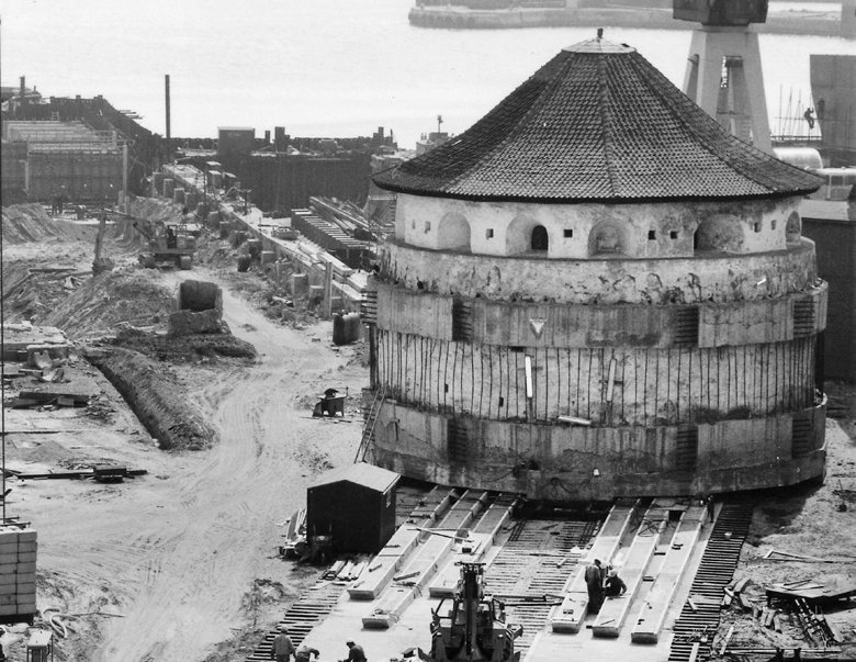 Hele Krudttårnet blev støbt ind i en betonkappe, der skulle holde sammen på det hele, og der blev støbt en flad plade under tårnet, som skulle løftes op og glide på teflonbelagte skinner. Samtidig gik Monberg & Thorsen i gang med at udvide tørdokken. Men så skete katastrofen!