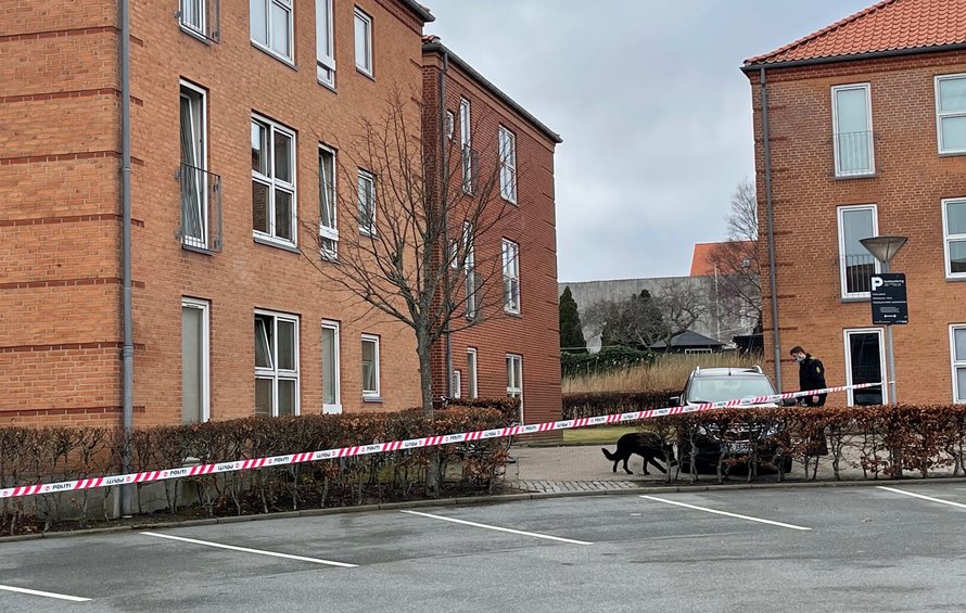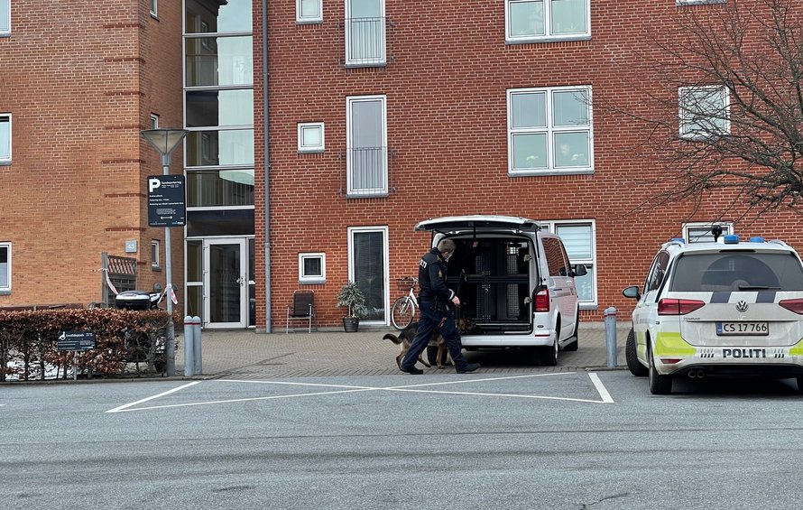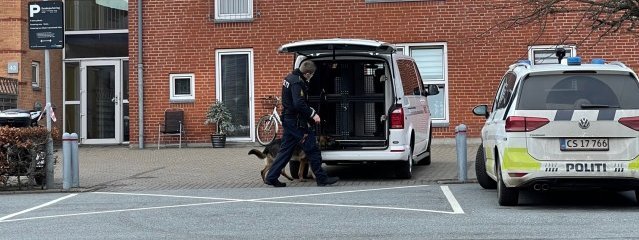 Der holder adskillige politibiler i området, og lige nu - kl. 14.20 - er hunde i gang med at undersøge det afspærrede område.