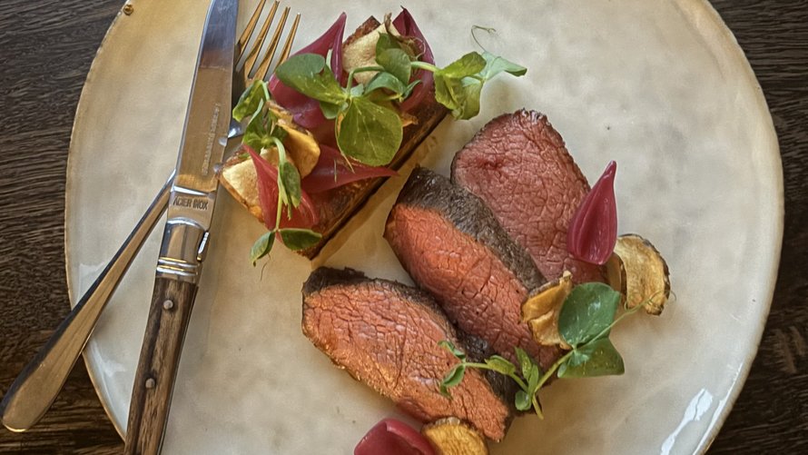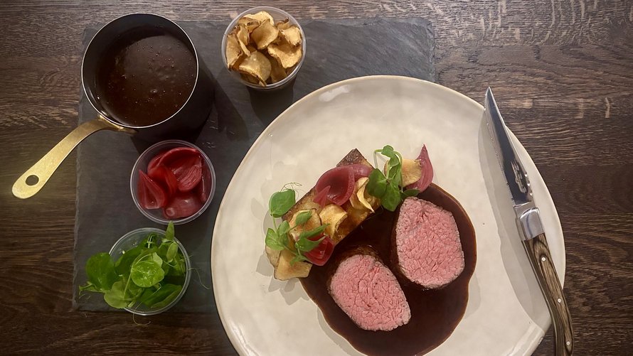 Pommes anna, syltede røde perleløg og bagte pastinakker - serveret med portvinssauce