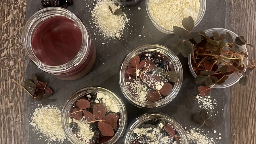 Marinerede solbær og karamelliseret chokolade