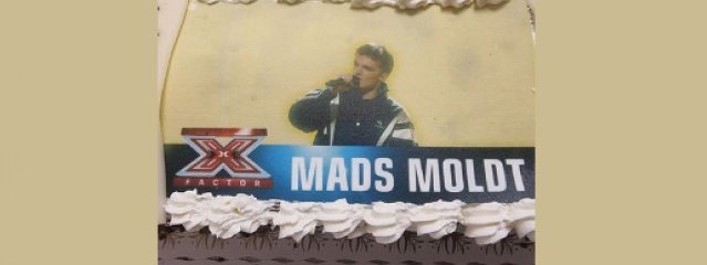 Fredag aften, når finalen er forbi, fejrer familien fra Åsted første-, anden- eller tredjepladsen med en X Factor-kage fra Bager Madsen i Frederikshavn. Naturligvis er der et billede af Mads Moldt på gulerodskagen, som er lagt sammen med oste-smørcreme. Kagen kan købes i Vestergade, og den koster 58 kroner.
