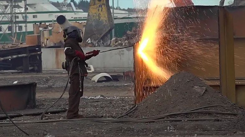 Det er arbejde med skærebrændere, der afgiver røg. Det undgår man, når skrot i stedet bliver klippet op i småstykker med en af virksomhedens tre klippere.