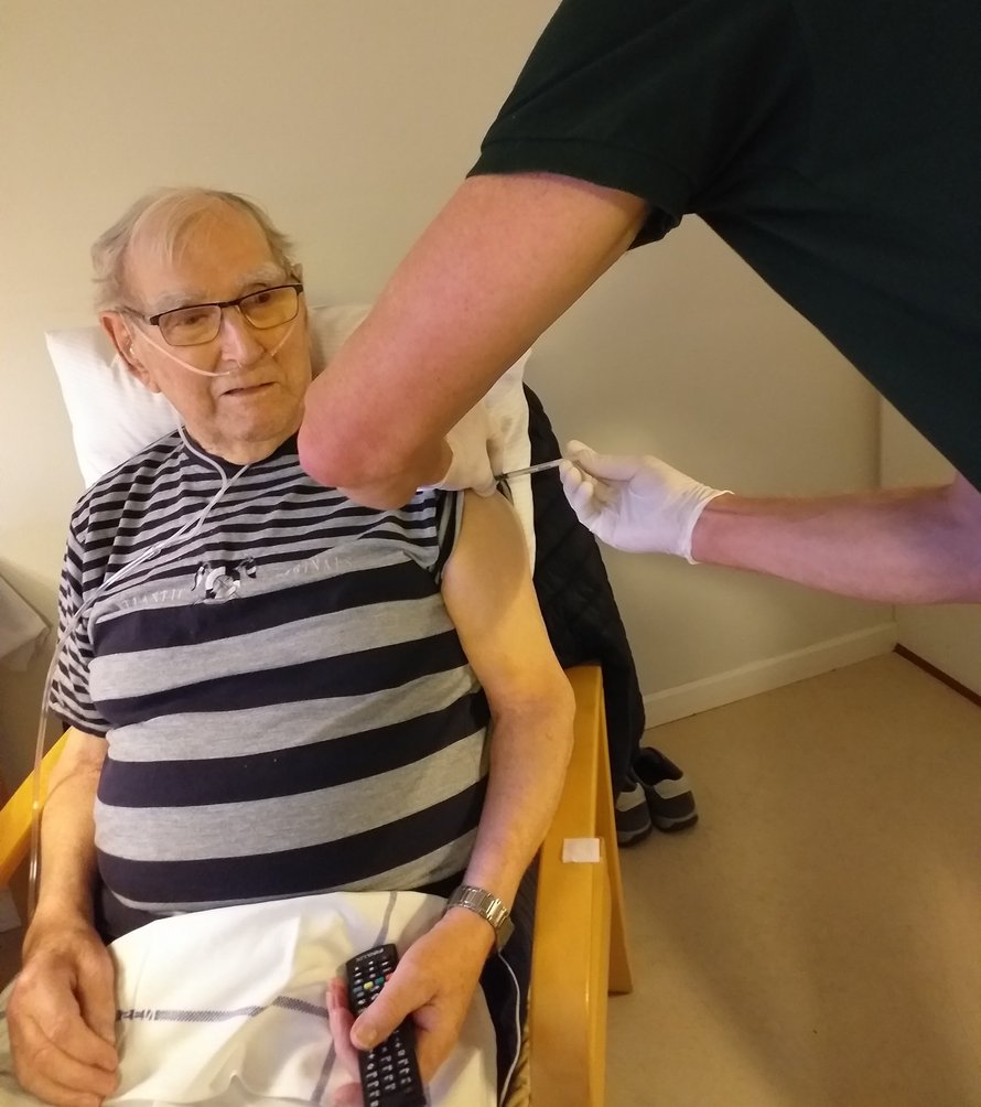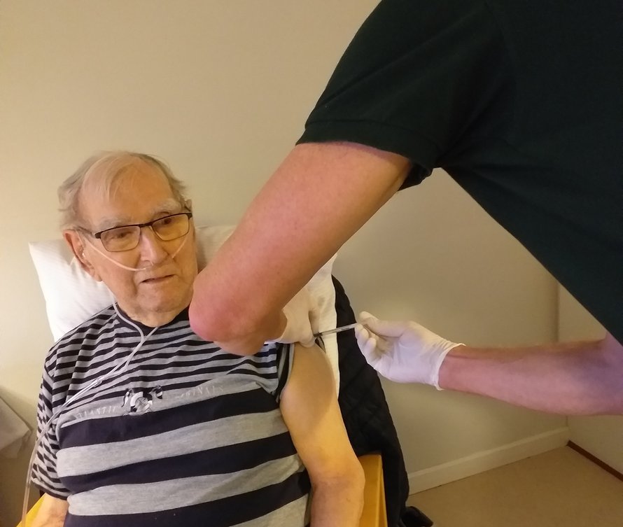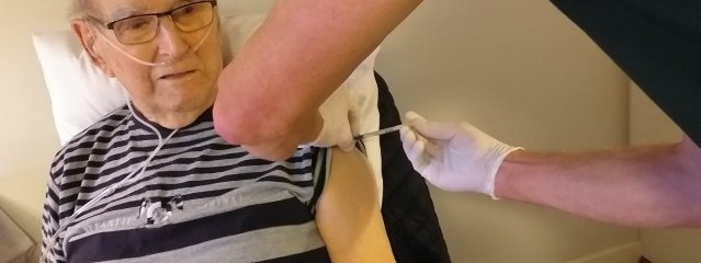 På billedet ses Peter Andersen, som var én af de første, der blev vaccineret på Kastaniegården i Frederikshavn.