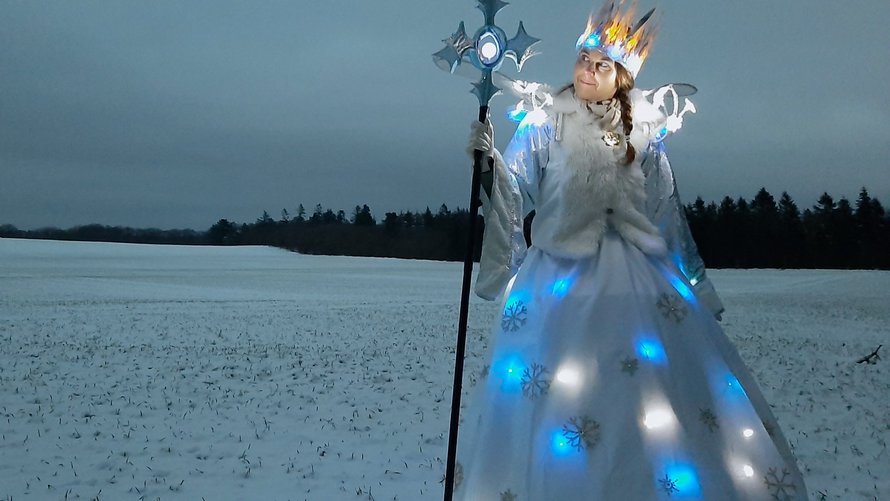 Imens musikken spiller, går Snedronningen rundt og hilser på store og små. Beredskabets brandbil holder på pladsen - klar til at hjælpe Snedronningen med at tænde træet med manér.