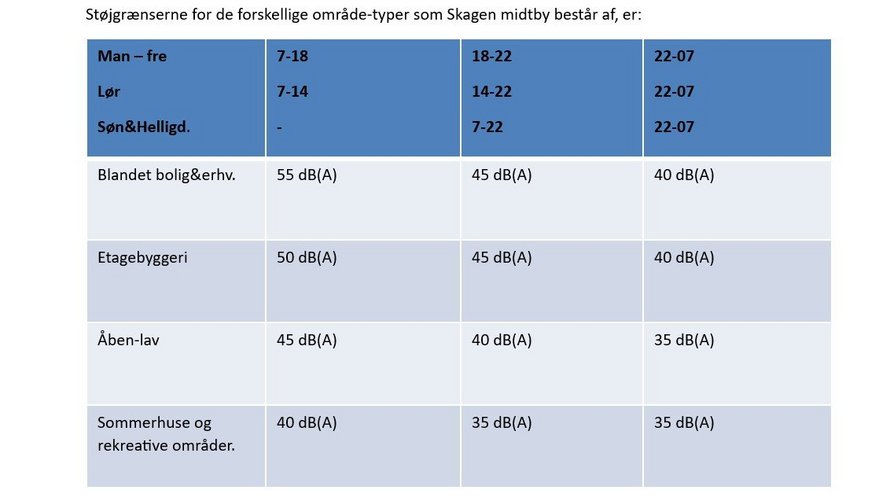 Støjgrænserne for de forskellige område-typer som Skagen midtby består af, er: