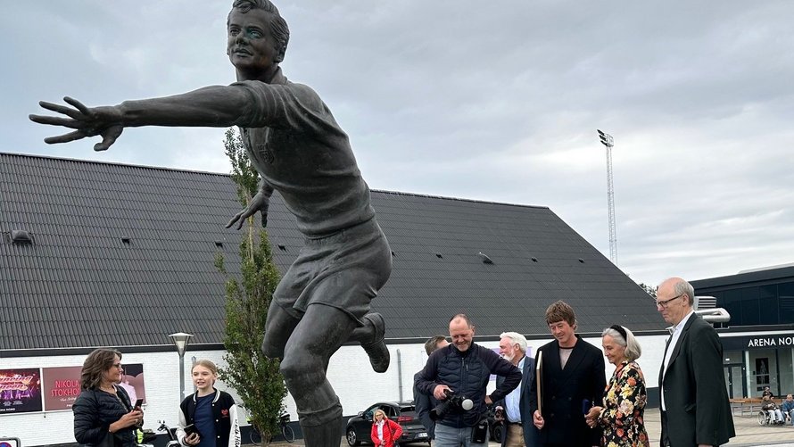 I digtet springer Guld Harald ned fra soklen foran Arena Nord, griber bolden, tager den med sig og bliver dreng igen.