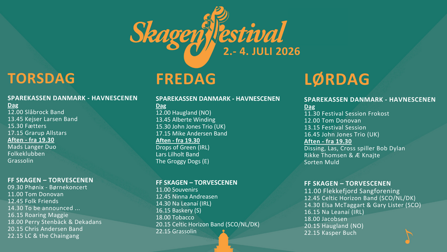 Skagen Festival 2026 byder igen på et bredt musikprogram, hvor både fællessang, folk, pop og stærke live-oplevelser er i centrum.
