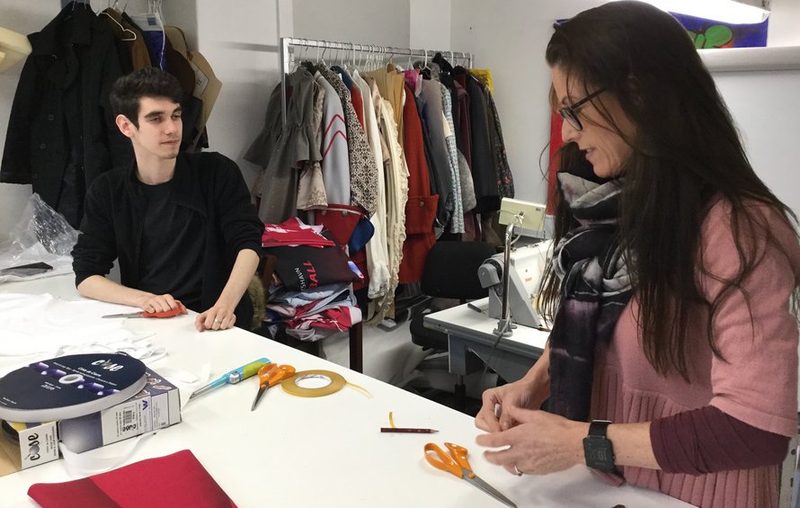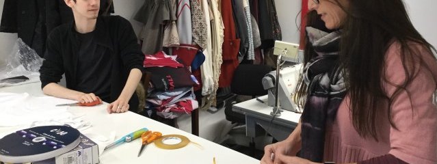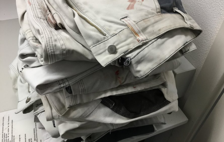 En stak plettede arbejdsbukser med et langt liv bag sig venter på en stol. På bordet ligger gamle koncertbannere fra Det Musiske Hus i Frederikshavn. Materialerne er en vigtig del af tekstil-værkstedet på FGU Vendsyssel, men den største ressource er de unge og deres kreativitet.