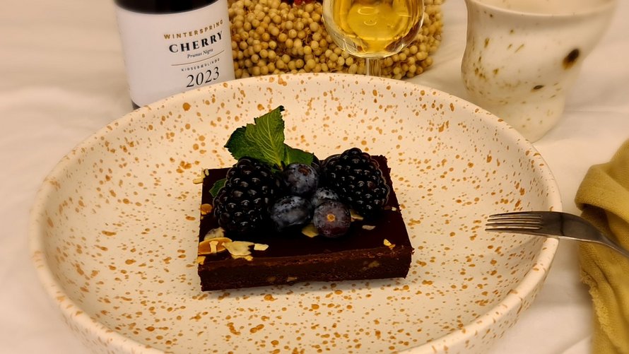 Aftenens smagsindtryk slutter af med en kompakt brownie lavet på en bund af valnødder og smagt til med fyldig og lækker chokolade samt en ren top med ren chokolade og mandel. For at skabe en god kontrast til den fyldige brownie inkluderes friske brombær og blåbær, hvor syren skaber harmoni i retten.