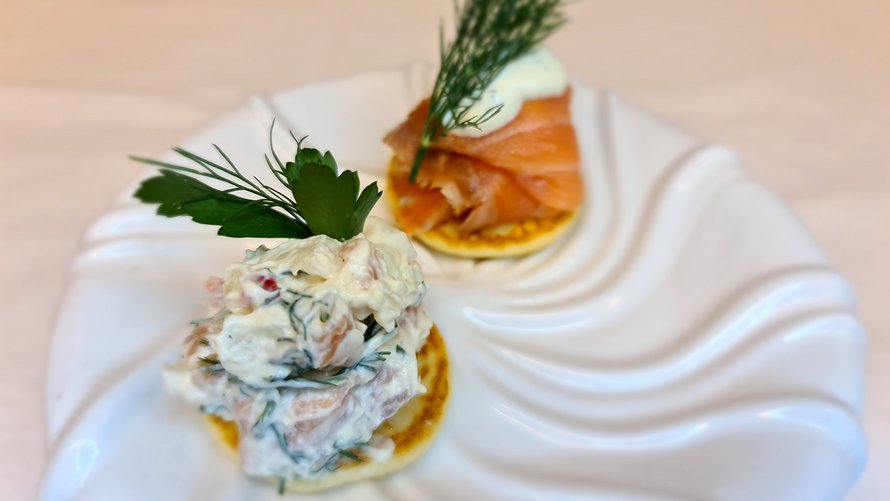 - Som sidste år er det også muligt af tilkøbe appetizers. Disse består af en duet af laks på blinis. Den ene blinis består at en cremet dild og citrus dressing med et stykke koldrøget laks. Den anden består af en friskrørt laksesalat elementer af purløg, chili, løg og cremefraiche, siger Per Rasmussen.