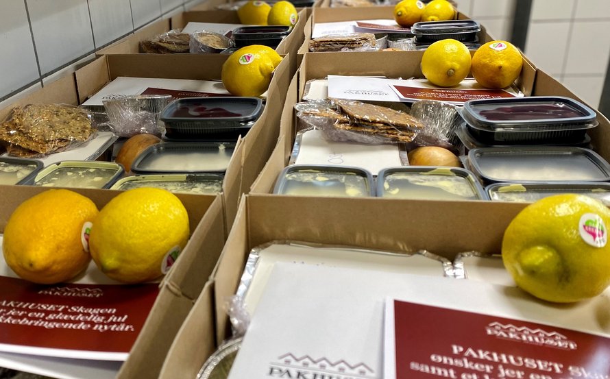 PAKHUSET Skagen har onsdag eftermiddag pakket og afleveret julekasser til flere familier i Skagen, som nu kan forsøde juledagene med koldrøget laks, fiskesuppe, sild, rødspættefileter, røget and, ris á la mande og meget mere.