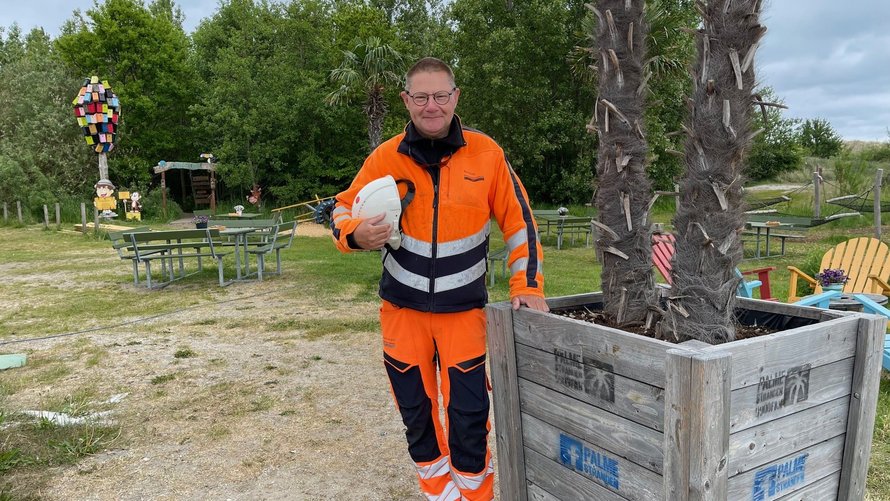 Palmerne har i år fået en lidt mere tilbagetrukket placering på Palmestranden i Frederikshavn. Michael Nielsen, Park, Vej & Ejendomme, forklarer i videoen, hvorfor palmerne står tættere på klitterne end vandet.