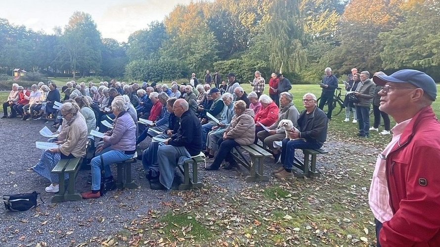 Det var en ganske underholdende aften i Plantagen, fordi korets formand, Lasse Flyvbjerg, mellem sangene underholdt forsamlingen med vittigheder.