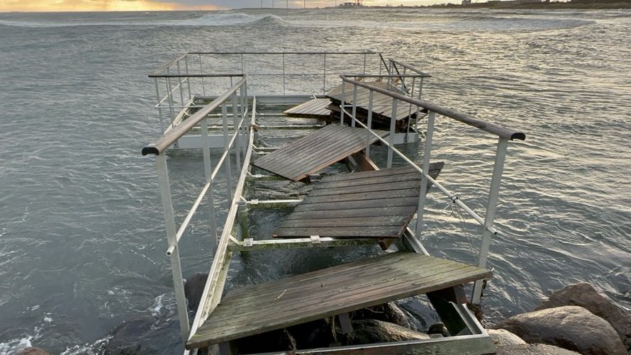 Den forhøjede vandstand efter stormen Pia har været hård ved den populære badebro på Rønnerhavnen i Frederikshavn, og vandet har stået rekordhøjt oppe på Palmestranden.