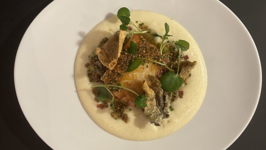 Trøffelmos, spidskål med bacon og syltede sennepsfrø