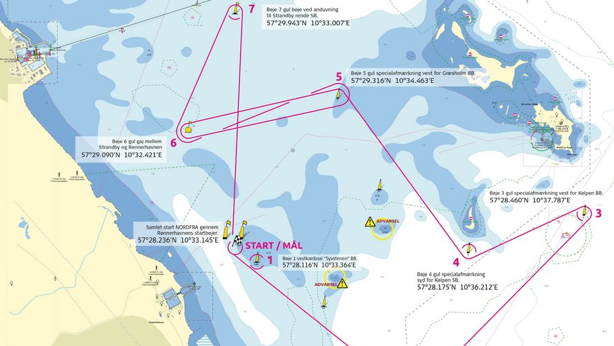 Rønnerhavnens Bådelaug har valgt at lave en bane, hvor deltagerne sejler i området indenfor Hirsholmene og mellem Frederikshavn Havn og Strandby Havn.