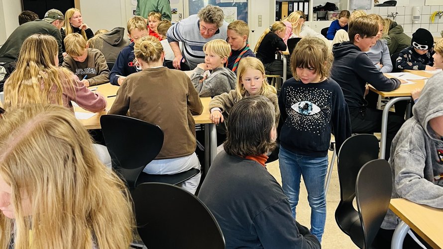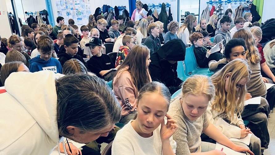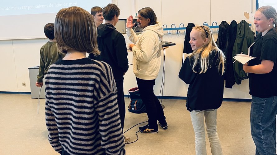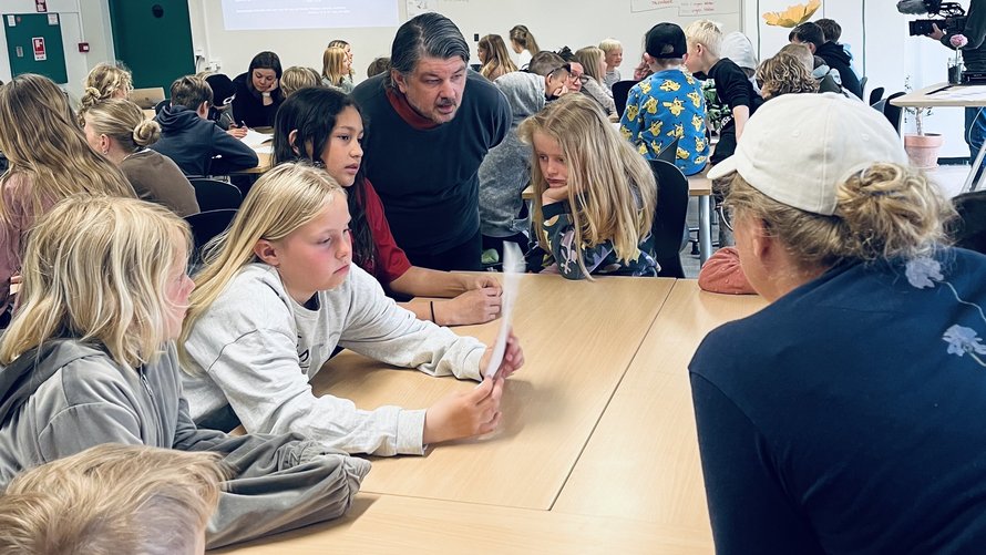 Fra klasselokale til festivalscene: 200 børn bidrager med indhold til en ny Sæbysang, som skal opføres på Sæby Festival sammen med musiker Michael Møller.