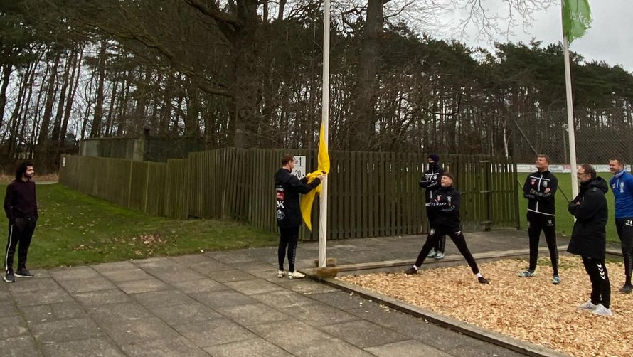 Selv om det var lidt koldt, var der mødt omkring 35 omklædte spillere op til søndagens standerhejsning i SEIF. Efter en kort tale af formand Bjarne "Don P" Pedersen blev vimplen hejst af Jeppe Birklykke.