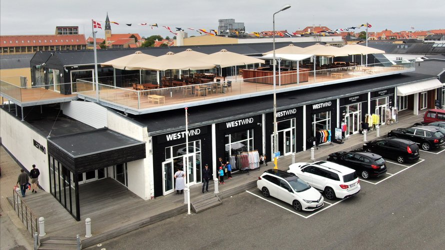 Der er også to store butikslokaler i stueplan, der er fuldt udlejet til stabile lejere i form af WestWind og Klitmøller Collective. Begge butikslokaler fremstår lyse og indbydende med højt til loftet og optimale udstillingsmuligheder. Begge forretninger har gode lager-, kunde-, udstillings- og personalefaciliteter, og der er gode forhold for varelevering og kundeparkering direkte ved butikslokalerne.